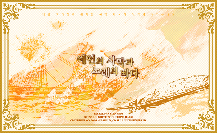 사막 한복판, 일견 평범해보이는 배가 모래를 가르고 나아갑니다. 나무로 된 배의 돛이 펄럭이고 배 뒤편으로 모래 가른 자국이 나타났다가... 흘러가는 모래에 금방 지워집니다. 선두에는 올곧은 자세로 선 사람 하나가 있습니다. 허름한 옷으로 몸을 가렸지만, 뿜어져 나오는 카리스마까지 가려지지는 않으니, 바로 사막왕입니다. 그는 손에 든 나무상자를 잠깐 내려다봅니다. 모래바람이 한 번 불고, 사막 한복판에 돌로 된 유적이 홀연히 나타납니다. 배가 천천히 유적 안으로 들어가고, 그 뒤를 따라 유적으로 들어가는 작은 배가 있습니다.