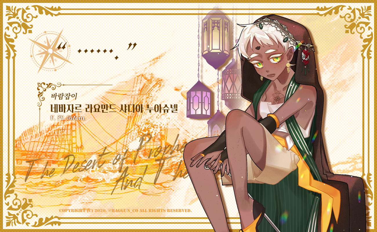 네바자르 라요만드 '샤디아' 누아슈넬:이 너른 물에도 모래바다만큼의 뛰어난 재생의 힘을 가지고 있지. 분명 사막에서 보지 못한 것들을 경험할 수 있을텐데.(지팡이를 툭툭 두들겨)