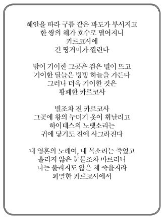 (그리고 그 다음에 뭘 찾았죠 곰곰곰...) 내 영혼의 노래여, 내 목소리는 죽었고 흘리지 않은 눈물조차 마르리니 너는 불리지도 않은 채 죽을지라, 파멸한 카르코-사에서... (이것도 시일까요... 더듬거리며 읊어봤어요)
