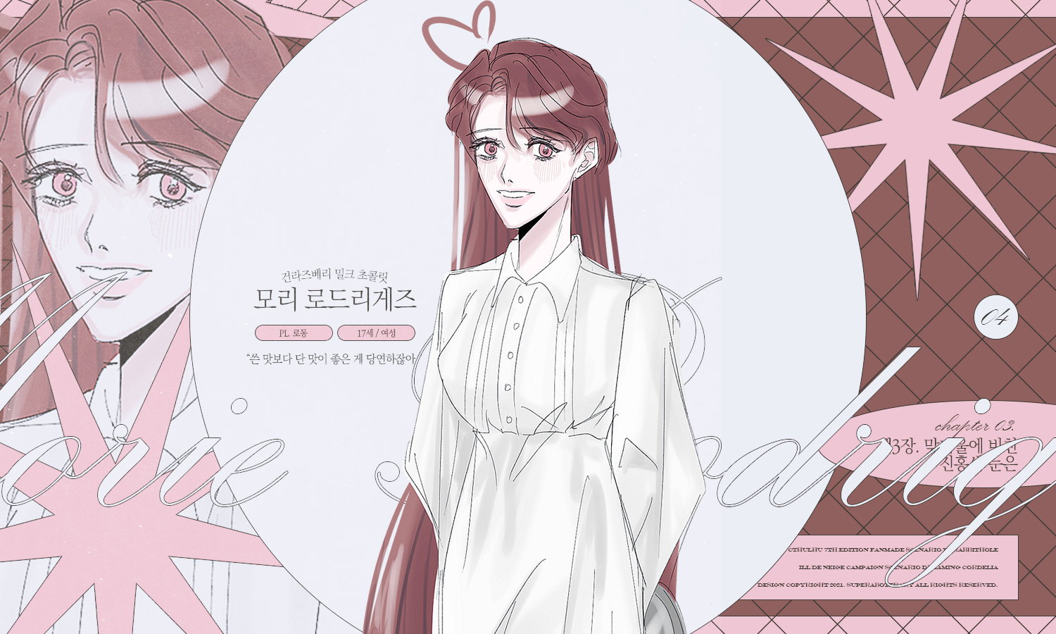 | 01. 서장, 코델리아의 동화 : https://moranlog.tistory.com/276 02. 1장, 마녀회 : https://moranlog.tistory.com/299 03. 2장, 유령은 꿈꾸지 않는다 : https://moranlog.tistory.com/308 04 3장, 맞거울에 비친 진홍색 눈은 : https://moranlog.tistory.com/337 05 종장, 눈의 녹는점 : https://moranlog.tistory.com/342 |